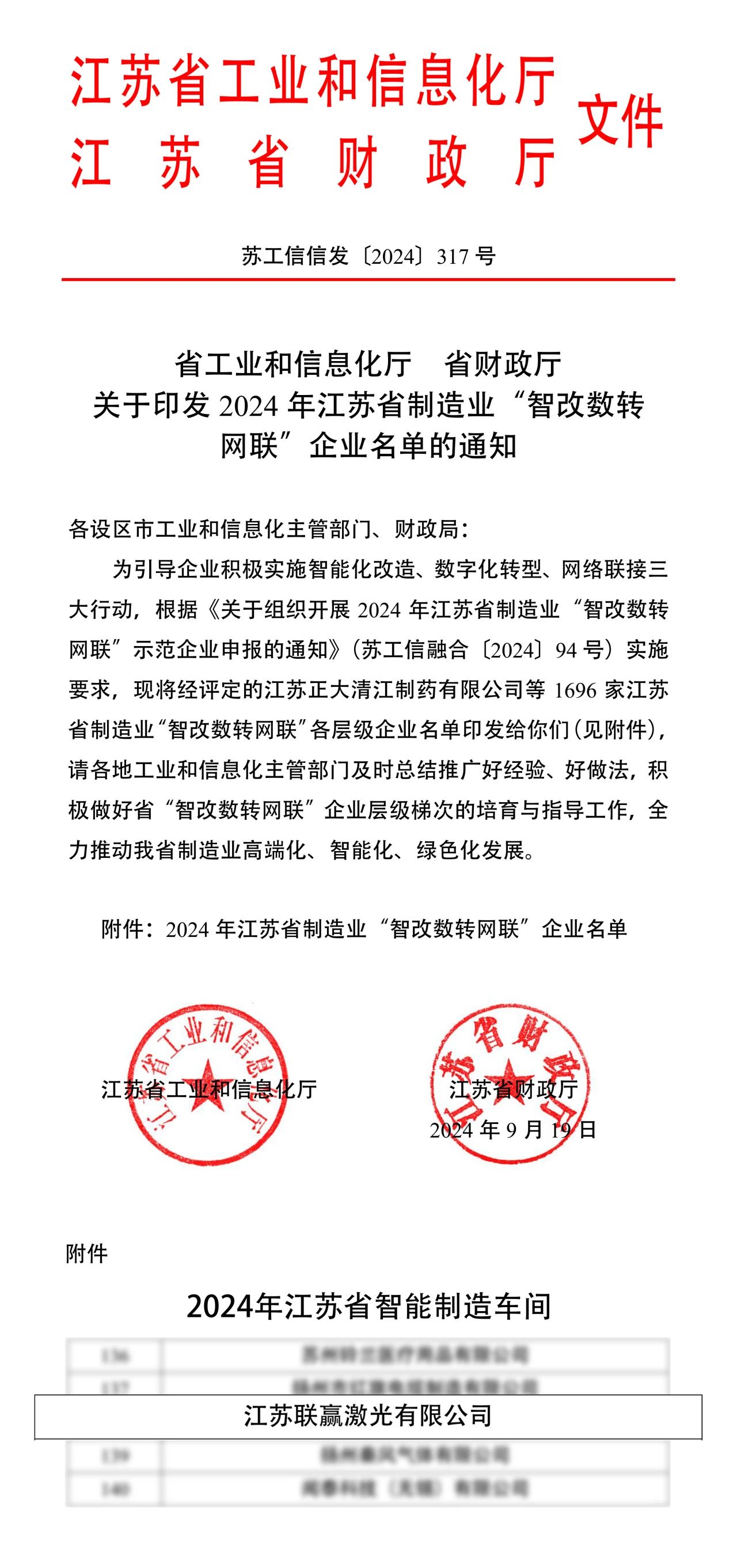 Recently, the Jiangsu Provincial Department of Industry and Information Technology officially released the list of intelligent manufacturing workshops for 2024. Jiangsu United Winners Laser Co., Ltd. (UW Jiangsu), leveraging its outstanding achievements in intelligent transformation and digitalization, has been successfully selected as a "Jiangsu Province Intelligent Manufacturing Workshop". This is the second time that UW Jiangsu has received this prestigious honor since it was first awarded the "Jiangsu Province Intelligent Manufacturing Workshop" in 2023! In addition, with its exceptional strength in intelligent manufacturing, UW Jiangsu has also been successfully recognized as a "Changzhou City Intelligent Manufacturing Factory".