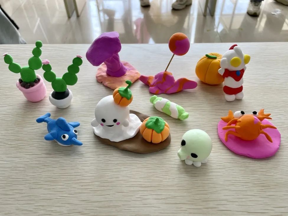最后的超轻黏土DIY环节可以说是丰富多彩呀,不少父母努力在网上找寻精致的图片和视频,现学现卖哦,小朋友们也表现的异常激动。作品也是千奇百怪,有南瓜、可爱鬼,仙人掌,太阳花,奥特曼,棒棒糖,螃蟹等。既培养了孩子的动手能力,也增进了亲子之间的默契与感情。