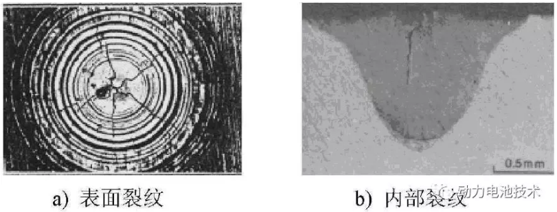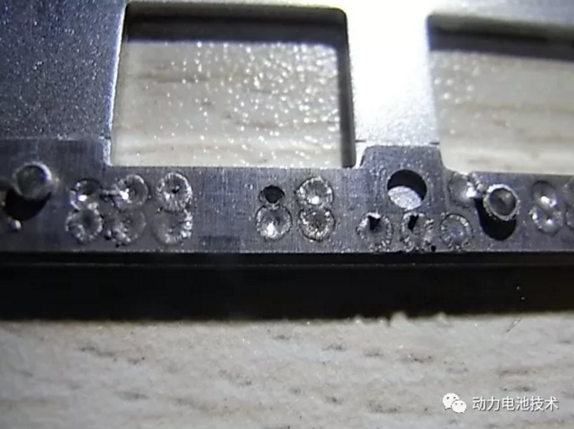 方形电池组合焊接时,极柱或连接片受污染厚,焊接连接片时,污染物分解,易形成焊接炸点,造成孔洞;极柱较薄、下有塑料或陶瓷结构件的电池,容易焊穿。极柱较小时,也容易焊偏至塑料烧损,形成爆点。不要使用多层连接片,层之间有孔隙,不易焊牢。