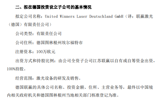 乐鱼leyu激光表示,本次对外投资设立德国乐鱼leyu,旨在使其作为公司开展欧洲业务的窗口,有利于公司拓展欧洲市场,符合公司经营发展的需要。本次对外投资是基于公司全球发展战略的一项重要举措,有利于提升公司企业品牌、产品品牌在国际市场的知名度,符合公司战略发展要求,不会对公司的生产经营造成不利影响,不存在损害公司、股东,特别是中小股东利益的情形。